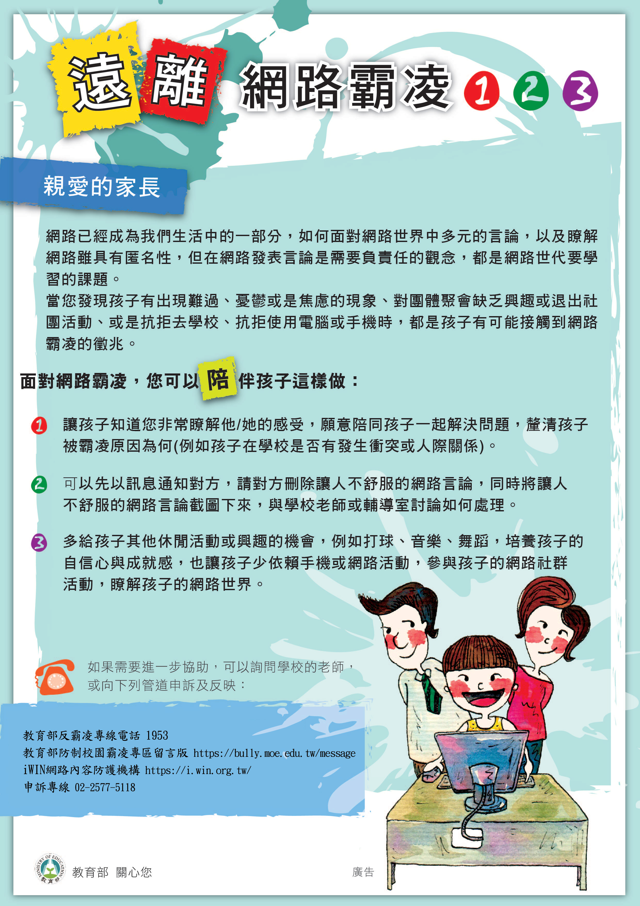宣導及摺頁 「防制網路霸凌」學生及家長宣導單 教育部資科司「防制網路霸凌」學生及家長宣導單.rar 2021-05-06